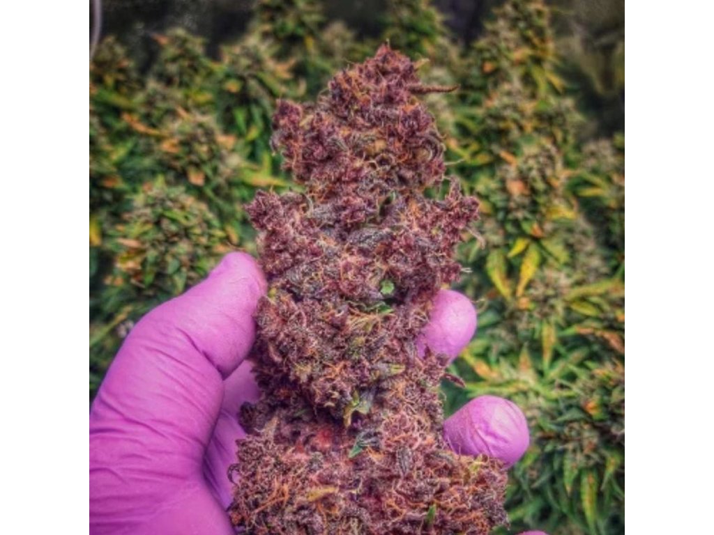 Najväčším vizuálnym lákadlom sú fialové kvety, ktoré v závere cyklu často získavajú hlboké odtiene purpuru. Kontrast vytvárajú oranžové piestiky a hrubá vrstva trichómov, ktorá môže pôsobiť až mierne ružovkastým dojmom. Celkový vzhľad je vyslovene „top-shelf“ a v balení pôsobí luxusne.